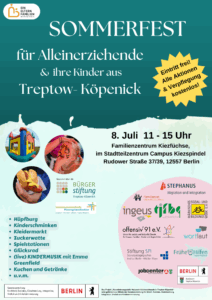 Das Netzwerk für Alleinerziehende in Treptow-Köpenick veranstaltet am 08. Juli 2023 ein Sommerfest für Alleinerziehende und ihre Kinder. Vorbereitet sind Aktions- und Mitmachstände, Spielestationen, eine Hüpfburg, BeautyGlücksrad, Kinderschminken, Selfcare Angebote für Groß und Klein sowie inklusives Essen und Trinken. Als besonderes Highlight tritt die Kindermusikerin Emma Greenfield live auf. Das Fest ist für die Alleinerziehenden und ihre Kinder kostenfrei.